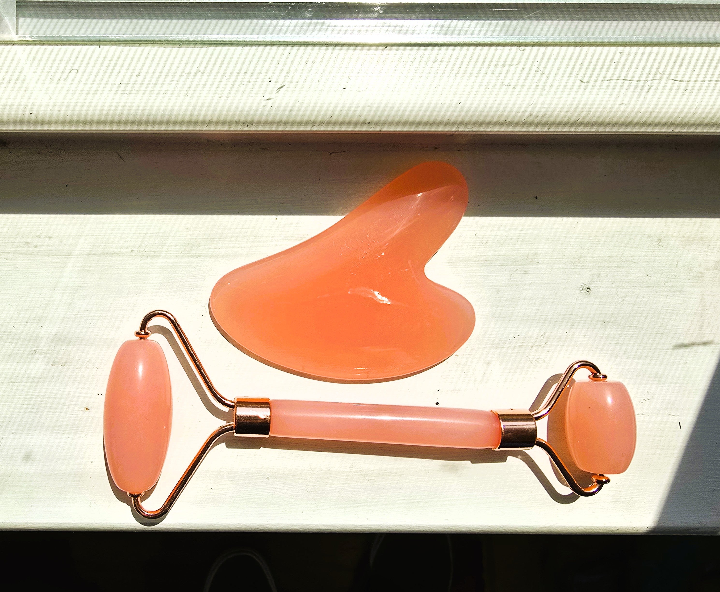 Rose Quartz Gua Sha Stone & Powder Crystal Roller