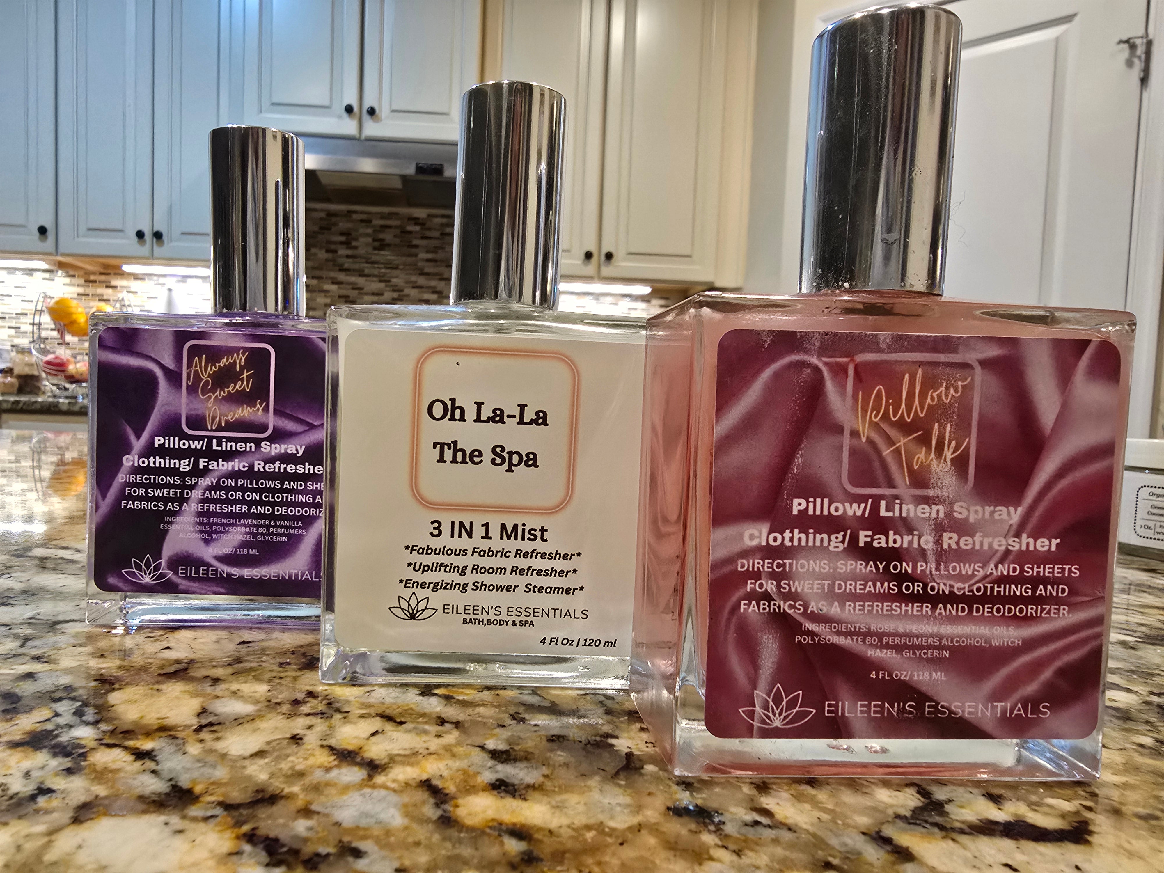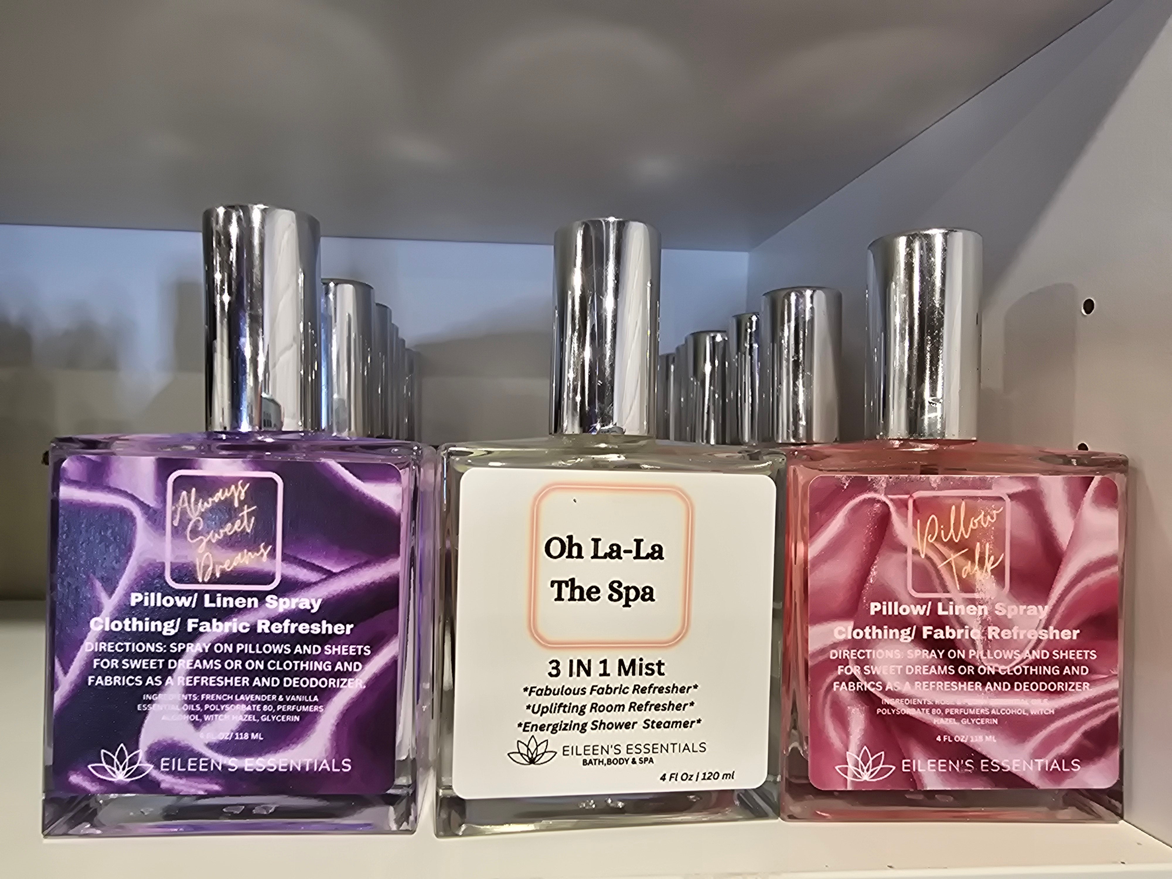 Spray 3 — Oh La La, It’s The Spa Bring the spa home: crisp neroli and bergamot mingle with hyacinth, lily of the valley, and jasmine for a clean, luxurious floral oasis. Spray into the bathroom for an indulgent shower steamer, refresh towels and linens, or mist the living room to reset the day—an instant uplift that transforms routines into ritual.