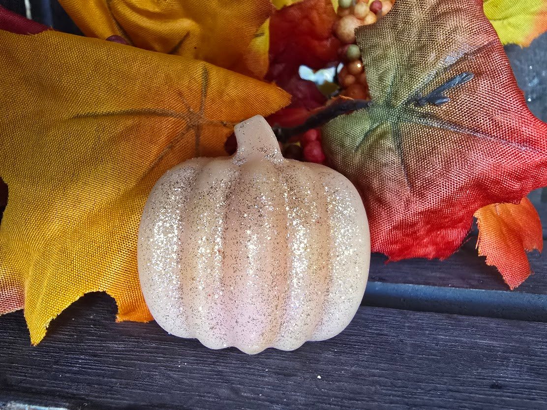 Lovingly hand-decorated with a touch of shimmering glitter that dances as it melts, these festive wax pumpkins bring a soft glow of fall magic to any room—no flame required. Each chunky pumpkin is approximately 2.5x3cm.